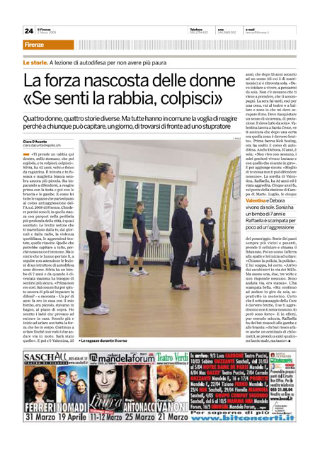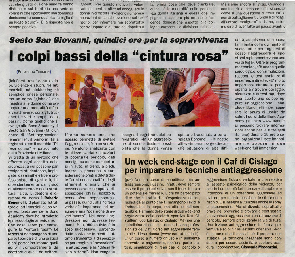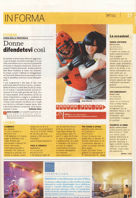IL PIACERE DI FARCELA Le occasioni della settimana Per una donna è importante sapersi difendere il 26 settembre a Sesto San Giovanni (MI) alla Bono Academy, si terrà un corso gratuito di antiaggressione aperto a tutte. Per partecipare, bisogna prenotare entro l’11 settembre al numero tel. 02/26265246.
