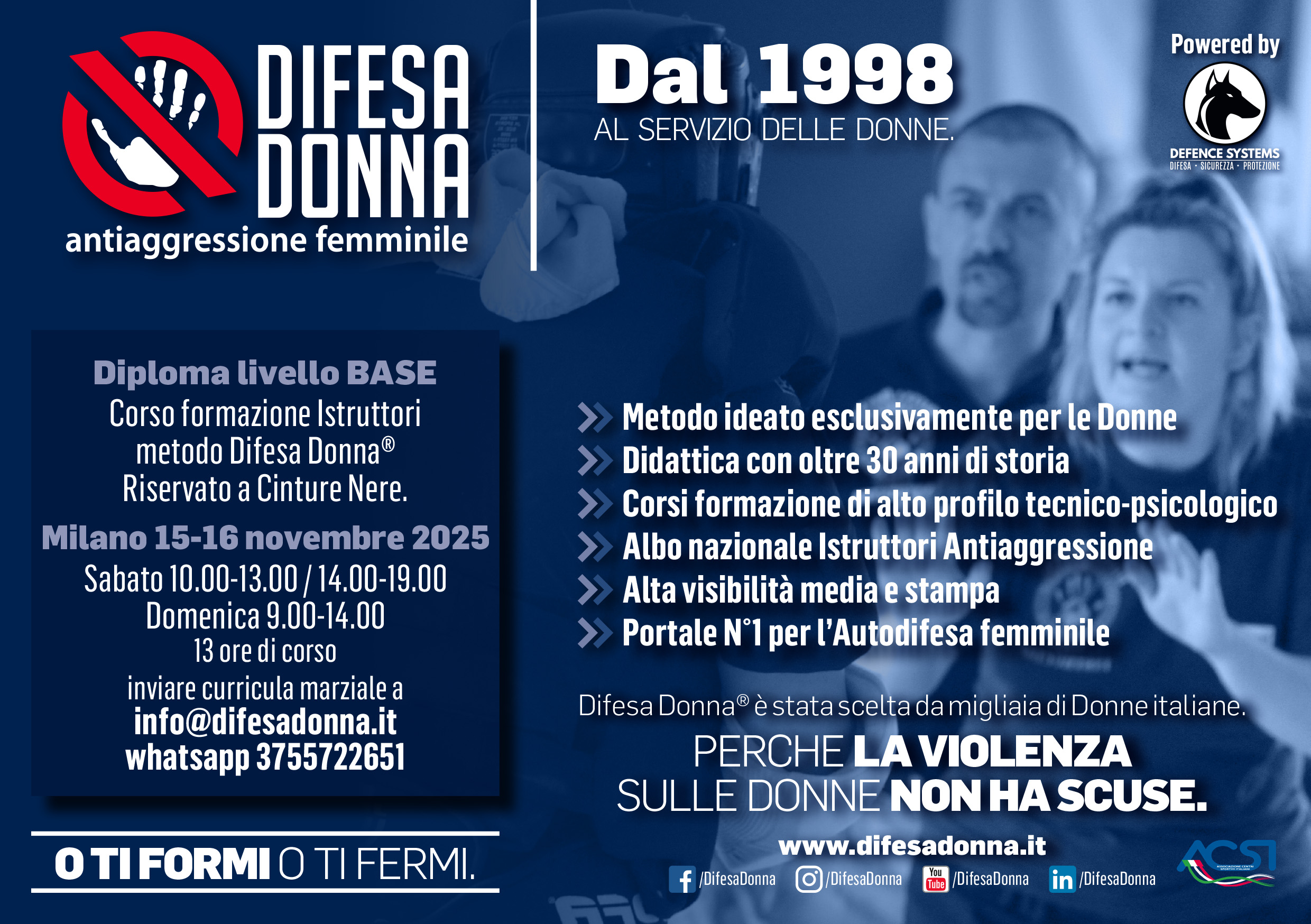 Corso formazione istruttori di antiaggressione femminile metodo Difesa Donna® presso la sede nazionale a Sesto San Giovanni (Mi). Riservato a Cinture nere di qualsiasi arte marziale e sport da combattimento.